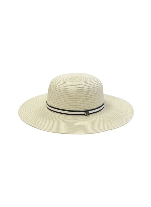 The Giselle hat is crafted from paper braid, a material created by weaving paper fibers processed to ensure durability and flexibility. The design is enhanced by a 1.5 cm two-tone band with a branded snap button. The wide brim measures approximately 9 cm. This hat is rollable and comes with a coordinated dust bag for practicality and protection.