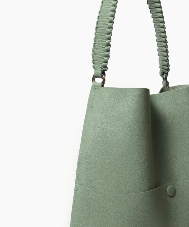 This medium-sized Slim Tote Bag is adorned with a hand-braided handle and features a practical external pocket. Relaxed yet stylish, this piece is the perfect sized tote bag for daily essentials and travel.