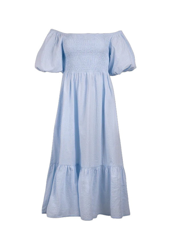 Soft, sculptural, and made for sun-drenched escapes — the Ophelia Smocked Maxi Dress is the definition of easy elegance. Designed in a lightweight cotton blend, this off-the-shoulder style features a fully smocked bodice that hugs the figure while voluminous puff sleeves and a tiered ruffle hem add a touch of drama.