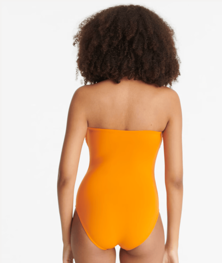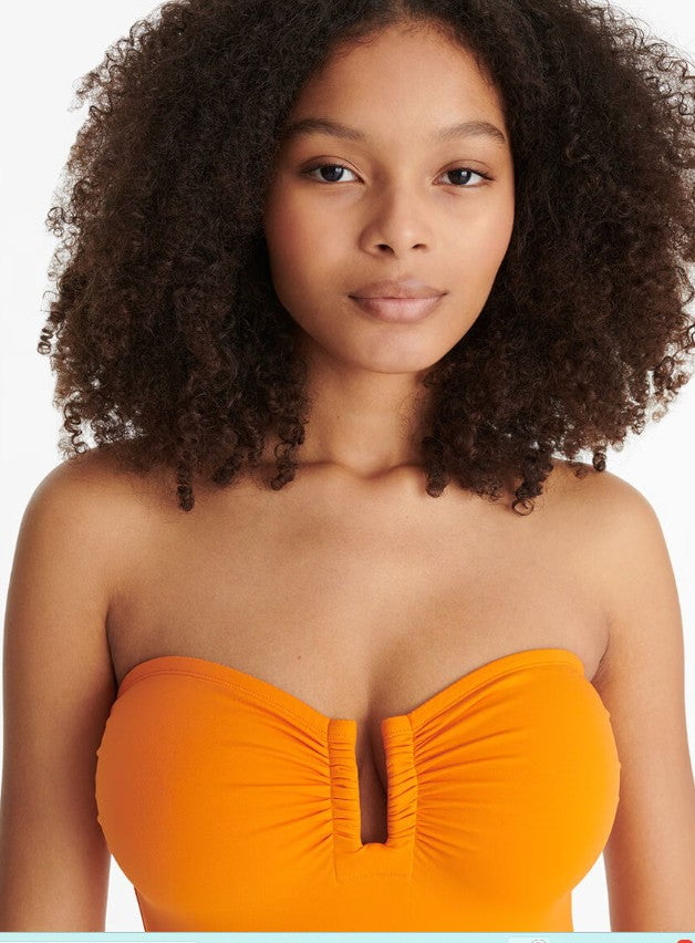 This iconic bustier one-piece, with gripper tape, can be recognised by its gathered cups separated by a U-shaped link. It enhances all body types.