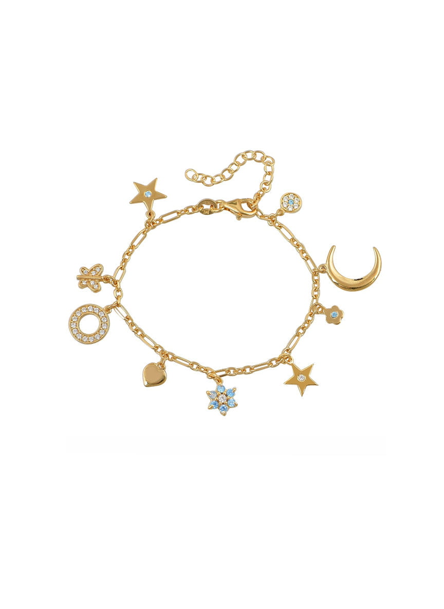 The Charm bracelet features little star, moon, heart, flower and eye motifs set with sparkling white and aqua crystals suspended from an adjustable wrist chain. 22 carat gold plated Sterling silver. One size only.