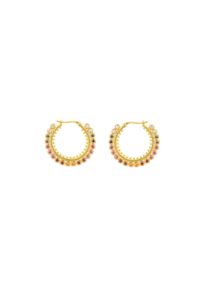 Dot are 22mm diameter slim hoops set with pale pink, purple, hot pink, red and orange coloured stones. Elegant with a touch of boho. 22k gold plated Sterling silver.
