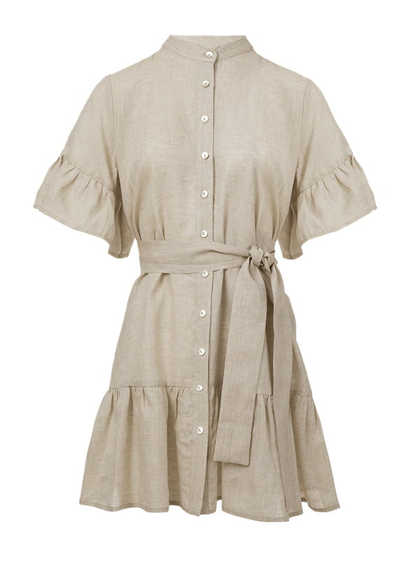 The Chara Ruffle Shirtdress is an effortless summer staple designed with soft femininity in mind. Crafted from 100% linen, it features ruffled sleeves and a ruffled hemline that add gentle movement to the classic shirtdress silhouette. A separate linen belt allows for adjustable styling, creating a flattering and relaxed fit.
