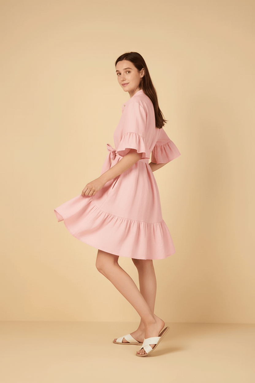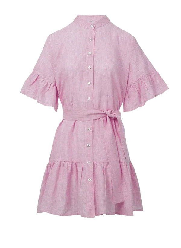 Crisp, feminine, and effortlessly chic – the Chara Ruffle Shirtdress is your warm-weather wardrobe hero. Made from 100% breathable linen, this versatile dress features a mandarin collar, a full button-down front, and fluttery ruffle sleeves and hemline for a playful yet polished finish.