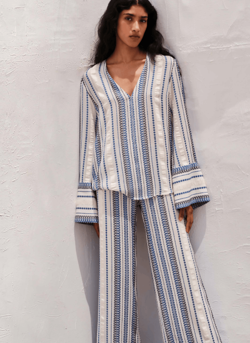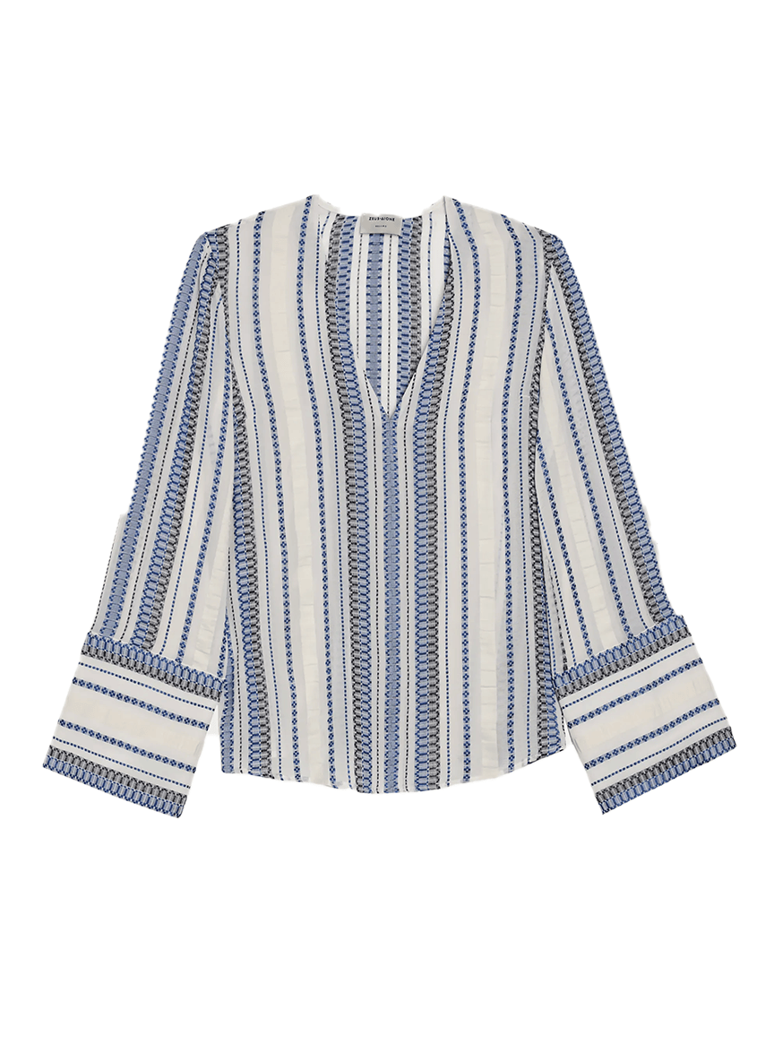 The 'Orion' blouse is tailored in a relaxed, slightly boxy silhouette and crafted from signature spathoto jacquard silk in ivory, woven with navy threads. It features a V-neckline and wide sleeves with split cuffs, lending the piece an effortless sense of fluidity.