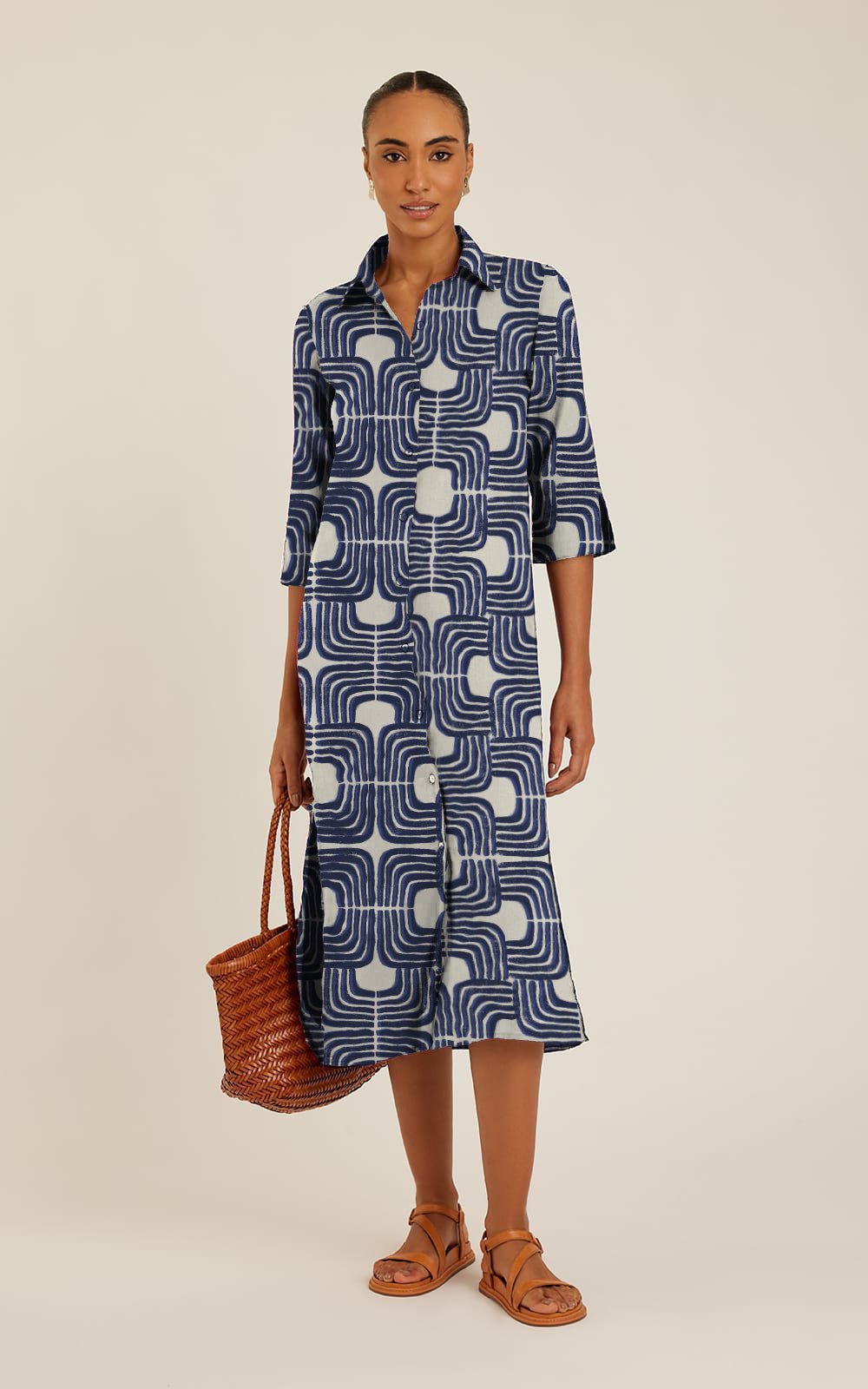 Crafted from 100% viscose, the fabric is lightweight, soft, and breathable—ideal for warm-weather wear. The Paros print features a striking navy and ivory geometric pattern, inspired by the serene architecture and coastal lines of the Greek islands, offering a modern Mediterranean flair that exudes timeless elegance.