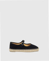 Padua mary-jane style flat espadrille in organic cotton with black leather trim, buckle closure and jute sole.
