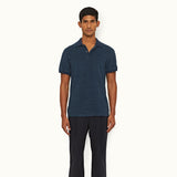 Orlebar Brown's classic Jarrett holiday polo shirt is updated in deep blue indigo toweling with the signature ribbed collar and cuffs. An instant holiday classic!