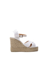 THE BROMELIA ESPADRILLES HAVE A CROSS FRONT AND FUN FRAYED LOOK THAT WILL TURN HEADS. MADE IN SPAIN WITH METALLIC LINEN, THEY FEATURE A ROUND OPEN TOE, ANKLE STRAP WITH SIDE BUCKLE, OPEN HEEL, 11 CM WEDGE AND DOUBLE VULCANISED-RUBBER SOLE.