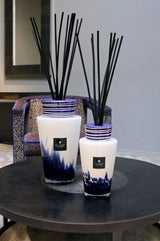 The opaque white glass is hand-blown with blue confetti details encrusted to give off a feather effect on the glass.