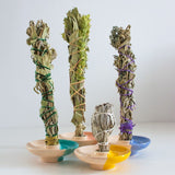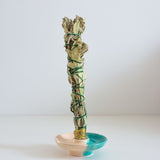 Once you're ready to extinguish a sage smudge stick, press the burning tip firmly into a fireproof vessel, dirt, or sand until the smoke no longer rises.