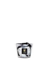 The scented candle is set in a hand-blown glass replicating grey marble with black strokes edged with beige. The elegance of the glass reveals the flame, giving an effect of a luminous stone.