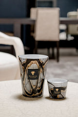 The scented candle is set in a hand-blown glass replicating grey marble with black strokes edged with beige. The elegance of the glass reveals the flame, giving an effect of a luminous stone.