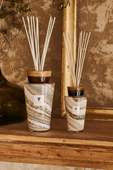 The Totem Siloli diffuser is finished with a brown and beige handmade ceramic stopper that matches the colors of the glass. It claims its place in an interior as a unique and refillable decorative object.