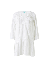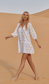 Add to your destination wardrobe with the Ashley Embroidered Short Dress. Elegant and feminine, it features delicate broderie cutwork throughout. Cut for a relaxed, loose fit, it boasts three-quarter length sleeves, with a dropped waist, falling to a short length. A cord at the neck can be tied to create a keyhole shape, while the crisp ‘White’ shade adds to its versatile appeal, making it ideal for slipping over your favorite Odabash swimwear or for days spent touring ancient sights.