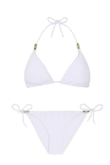 Rope Padded Triangle Top is a classic triangle bikini top offering the perfect amount of coverage and a little more support. With removable padding that enhances the cleavage, it features an adjustable rope necktie embellished with bespoke silver bamboo sliders and slim ties at the back. Classic Rope Tide Side Bottom offers the classic triangle bikini bottom with adjustable rope tie side, adorned with Heidi Klein silver bamboo. With a flattering rise at the front and back as well as medium coverage on the bottom.