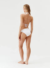 For a fresh update to the classic hipster shape, opt for the Grenada White Bikini Bottom new to this seasons Core Collection. The bikini bottoms feature golden tone trims. Pair with the matching halterneck bikini top, mirroring the link details and are finished with signature Odabash slider bar trims.