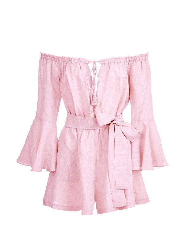The Electra Linen Off-Shoulder Playsuit offers a fresh alternative to the classic mini dress. Crafted from 100% linen, it features an elegant off-the-shoulder neckline and softly flared sleeves that create a flattering, feminine silhouette. Light, breathable, and effortless, this playsuit is designed for warm days and relaxed evenings alike.