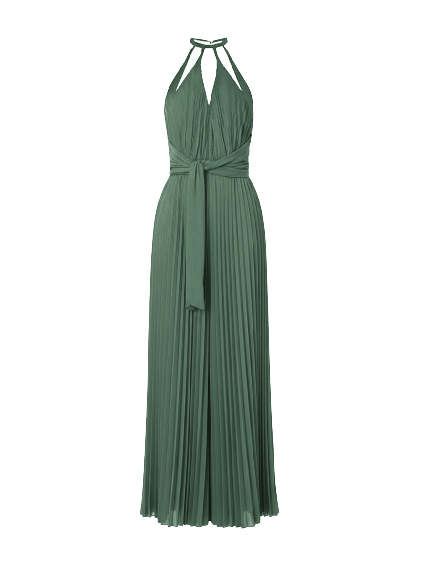 The 'Attis' jumpsuit embodies fluidity, its form defined by all-over accordion pleats that move with the body. Cinched at the waist by integrated side straps that tie softly at the center, it creates a structured yet effortless silhouette. The neckline features a series of narrow, gathered bands that connect to a choker-style halter collar, forming skin-revealing cutouts, before cascading into wide, cropped legs.