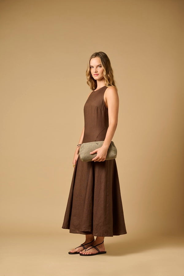 Designed with a clean sleeveless silhouette and a softly flared skirt, the Evelina Dress skims the body gracefully, creating fluid movement with every step. The natural weight of the linen adds subtle structure, giving the dress an elevated, polished feel that transitions seamlessly from day to evening.