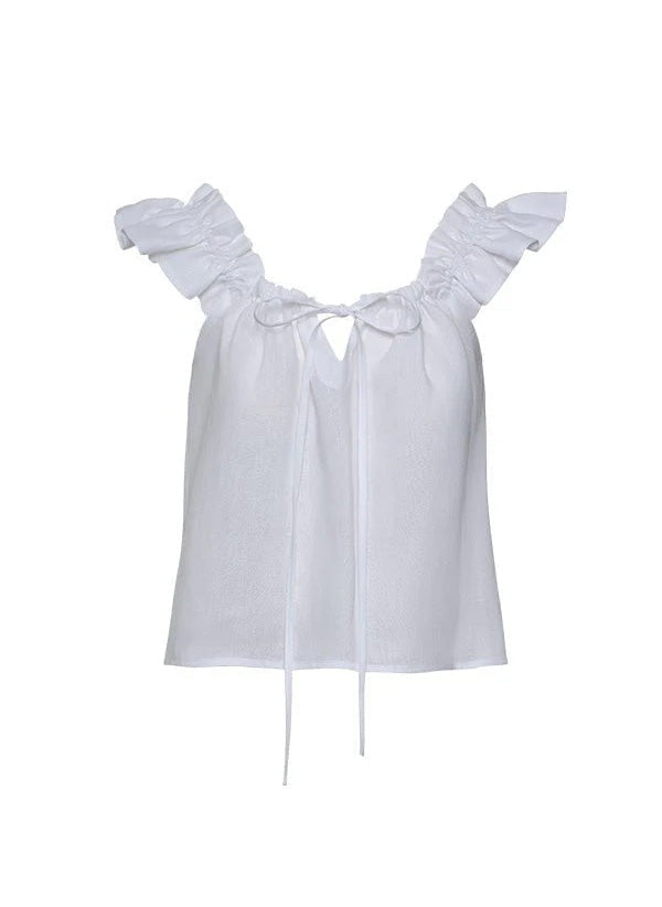 Charming and effortless, the Koko Linen Top is a warm-weather essential with a playful twist. Made from 100% lightweight linen, this sleeveless top features delicate ruffle-trimmed straps, a gathered neckline with tie detail, and a relaxed, floaty silhouette that flatters every shape.