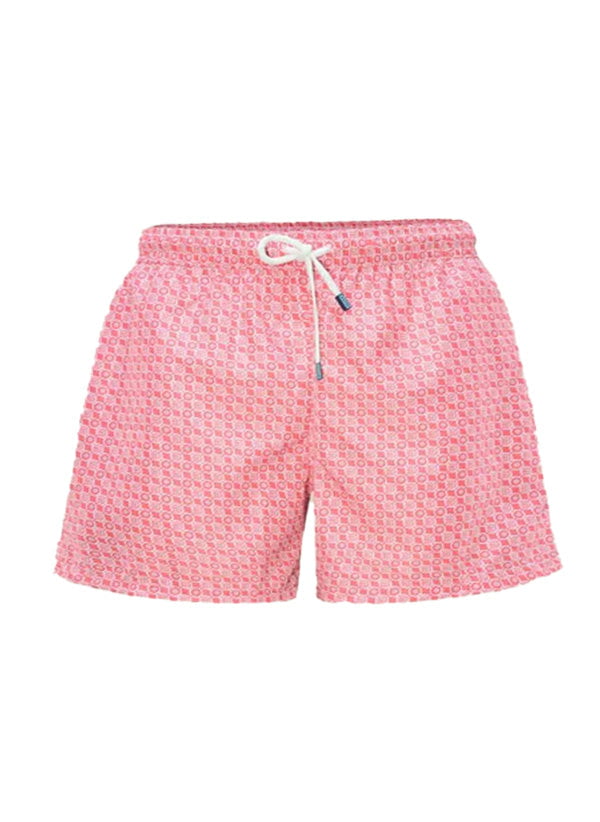 Embrace the Italian summer in unparalleled style with our iconic Madeira swim trunk. Crafted from recycled polyester, it offers a lightweight and quick-drying performance, drying out in only 90 seconds. The elastic waistband with drawstring ensures a perfect fit, while the contrast stitching and embroidered branding logo on the back pocket add a touch of refined elegance. Elevated with Summer-y pattern.