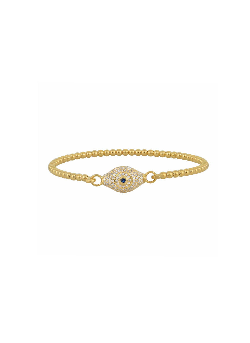 The white Mini Gala bracelet has a beaded wire band with a tension hook fastening and a white crystal encrusted eye motif with a deep blue centre stone. 22 carat gold plated Sterling silver. Two sizes XS/S (to fit wrist circumference 14cm to 15.5cm) and M/L (to fit wrist circumference 16cm to 17.5cm).
