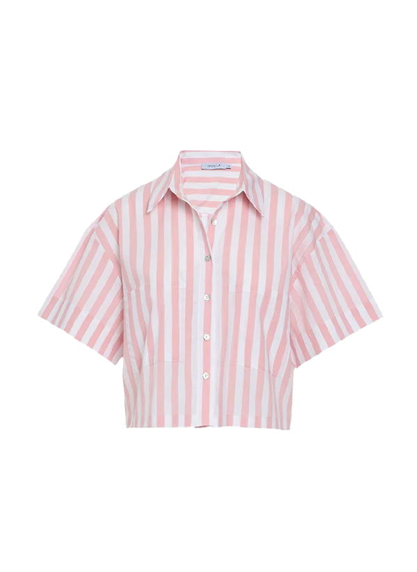 Bold, breezy, and effortlessly cool – the Myrto Cropped Shirt is the ultimate summer statement. Crafted from lightweight cotton, this boxy, short-sleeve button-down features a relaxed fit and eye-catching thick pink and white stripes that bring a playful pop to any warm-weather wardrobe.